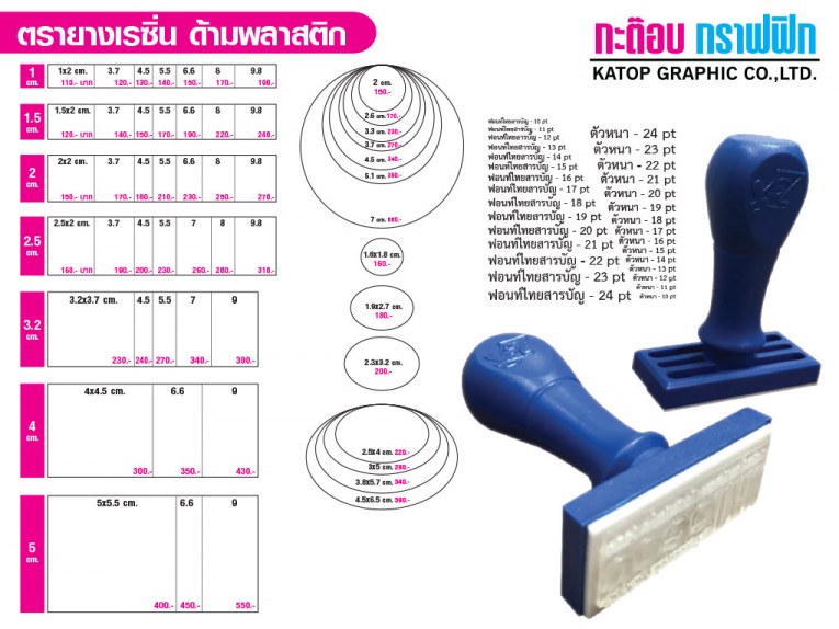 ตัวด้ามตรายางเป็นพลาสติก ที่มีตลับหมึกในตัว ข้อดีของด้ามหมึกในตัว สะดวกในการใช้งาน ไม่ต้องพกตลับหมึกให้วุ่นวาย วัสดุเนื้อตรายางทำจากเรซิ่น คุณภาพดี ทนทาน ใช้งานได้ยาวนาน มีทั้งแบบวงกลม วงรี และสี่เหลี่ยม *ราคาขึ้นอยู่กับขนาดของด้าม